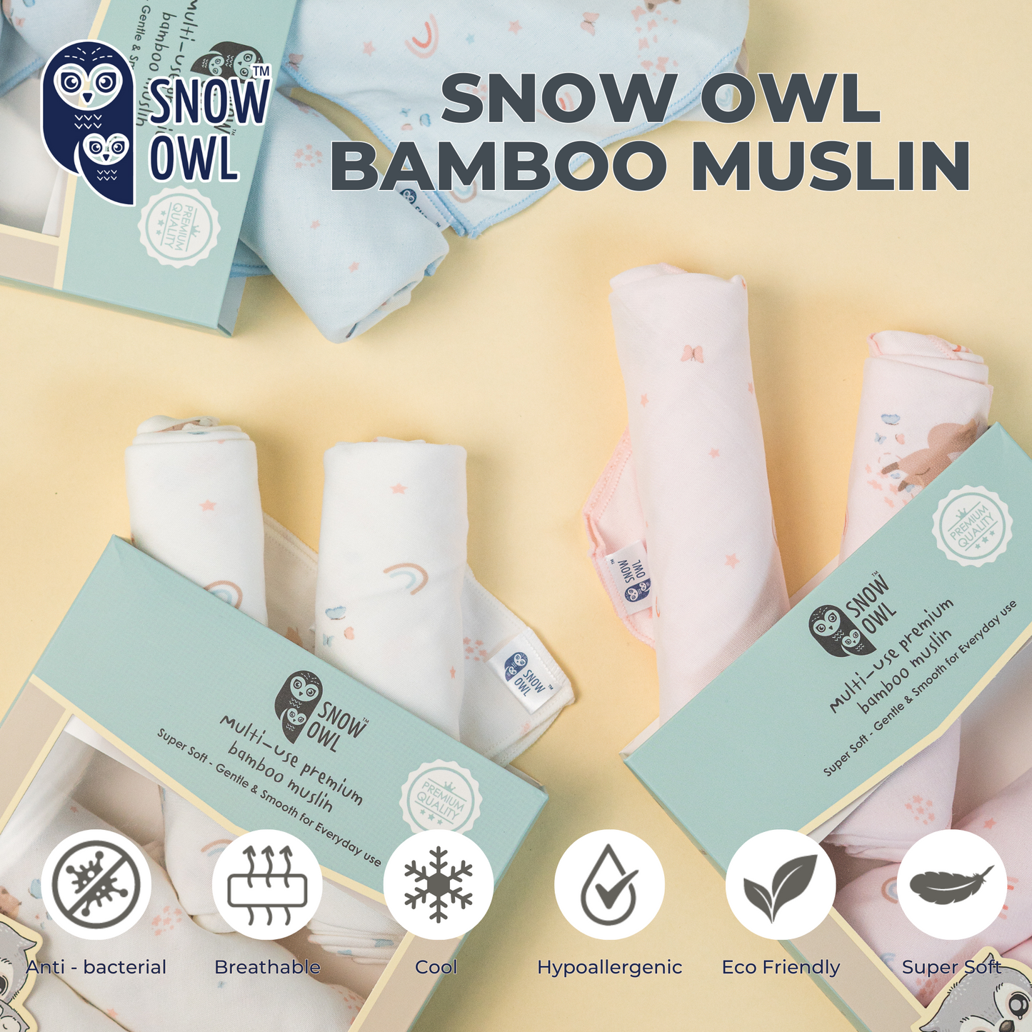 A celebration of 100% premium bamboo fiber crafted into a versatile muslin cloth. Revel in the unmatched softness and daily comfort, as this lightweight, cool fabric gently caresses your skin. Perfect for various uses, our hypoallergenic bamboo muslin cloth redefines everyday elegance, ensuring no allergies or irritations. Elevate your experience with the extraordinary softness and versatility of Snow Owl.